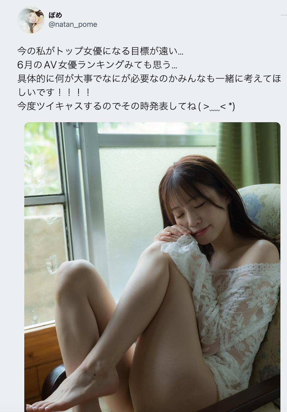 简单做个翻译:未歩なな(未步奈奈)的意思是看了6月的销售排行榜后觉得自己离TOP女优的目标好远,请大家一起帮忙想想有什么办法可以让她再往上提升?之后她会开直播和大家分享〜