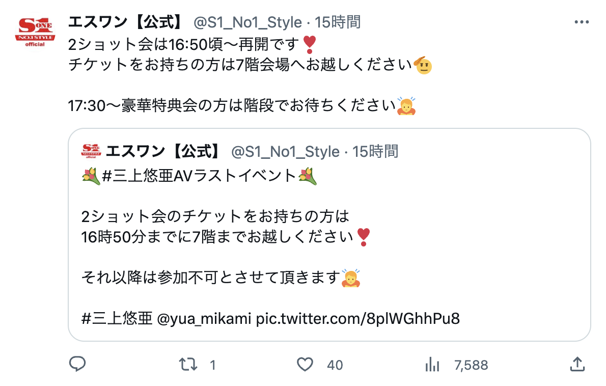 然后呢?然后昨天下午S1官方twitter开始疯狂发文用各种方式希望能多来一个是一个ー相信我,我是业者也曾经碰过门票卖不完的艰难时刻,S1官方twitter的各种招术我都用过:像是「每一场还有少数门票即将额满」、「反应热烈所以活动时间延长想要参加的影迷手脚要快」还有「今天三上穿得超可爱的那下一件会是什么超华丽的服装呢」⋯这些招术都说明了一件事,那就是门票销售的状况没有很好,见面会位置有剩而且不是剩一两张那种,是场子会看起来有些冷清的状况: