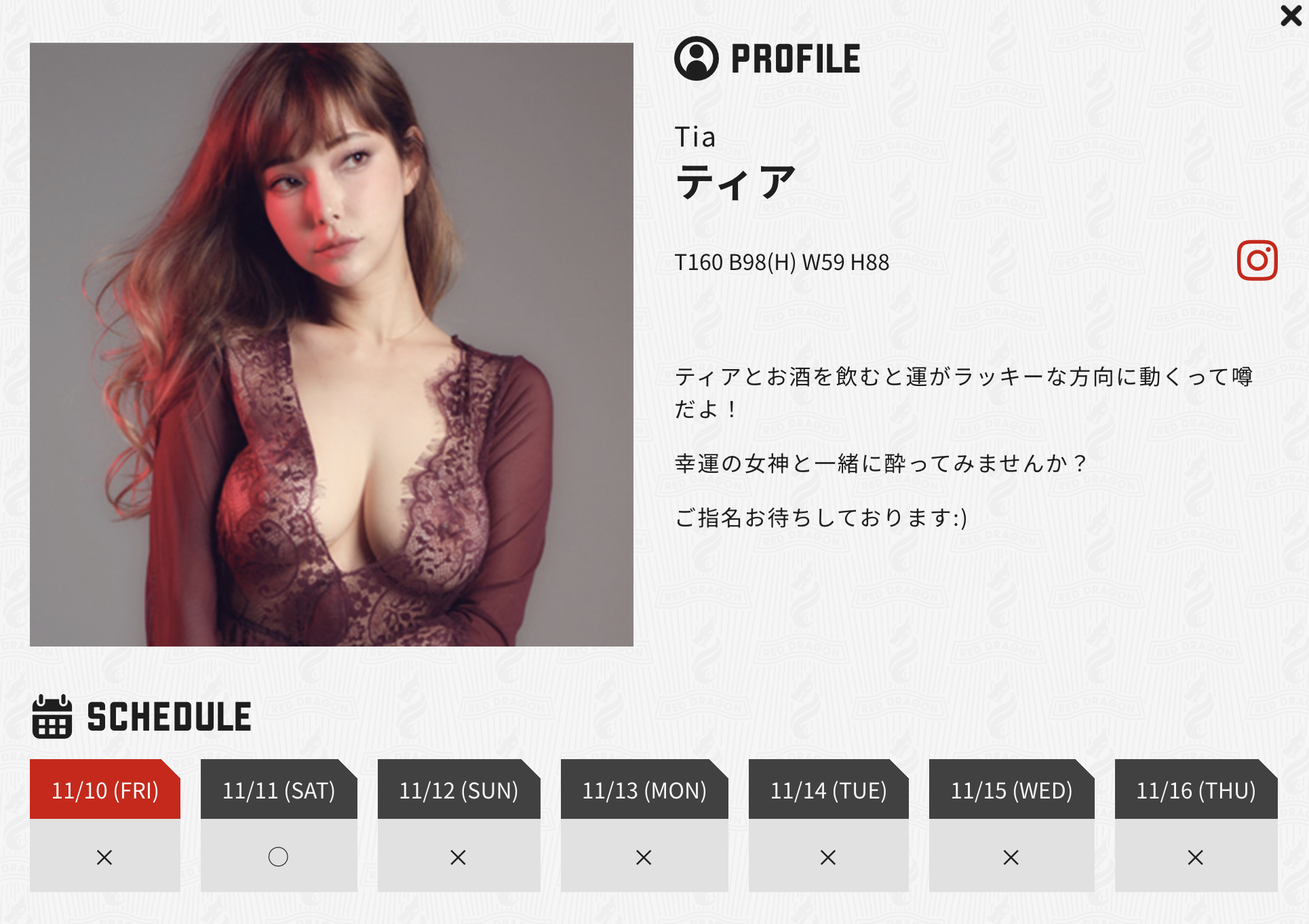 先讲我们是在哪里见到她的:要找ティア(Tia)不难,不必动用关系,只要看酒店「レッドドラゴン(红龙,Red Dragon)」的出勤表等她有上班的时候指名就行;再来,2018年后淡出AV界的她去了哪里?ティア(Tia)说她退出了经纪公司マインズ(Mine's),现在除了到レッドドラゴン(红龙,Red Dragon)陪酒也会接一些小型的商演活动,想找她很容易,不用透过谁,她会很热情地和你加Line: