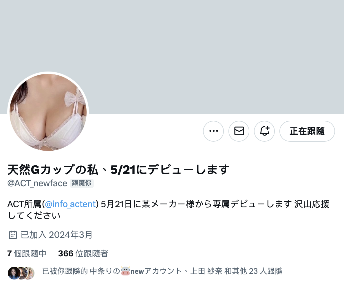 经纪公司ACT昨天让这位「天然Gカップの私、5/21にデビューします」(天然G罩杯的我,将会在5月21日出道)注册了X的帐号(https://twitter. com/ACT_newface),目前已经有了超过350个追踪者〜