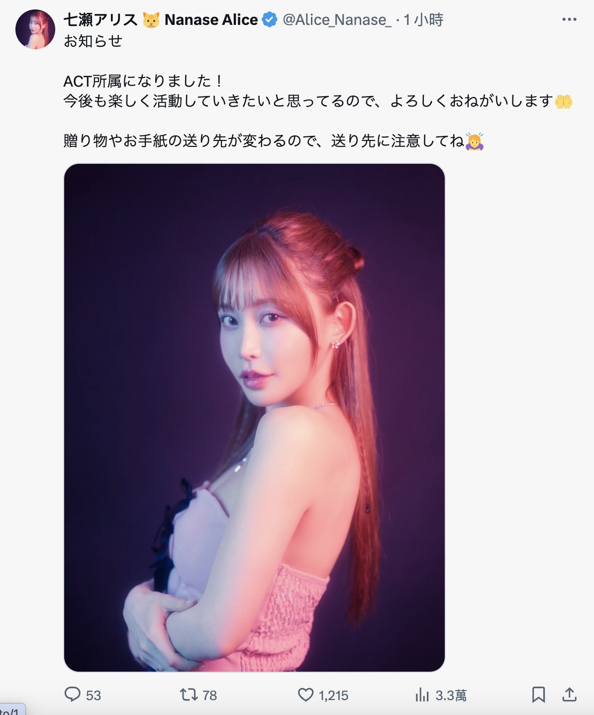为了那个伟大的目标!七瀬アリス(七濑爱丽丝)更换事务所!