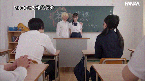 那这支漫改作的剧情呢?雨宫ひびき(雨宫响)饰演的是转校生「狮子坂リサ(狮子坂梨沙)」,不过不是魔界学校的毛鹰,而是淫乱教室ー在班上的帅哥「灰枝」、也就是剧照里金头发的那位男优「桥本诚吾」主导下,这个班级从早自习开始就是一直大乱交,全班同学不停地更换性伴侣,除了一个人、由AV男优ニック(尼克)演出的「狼谷」以外,大家每天都忙得胡搞瞎搞⋯