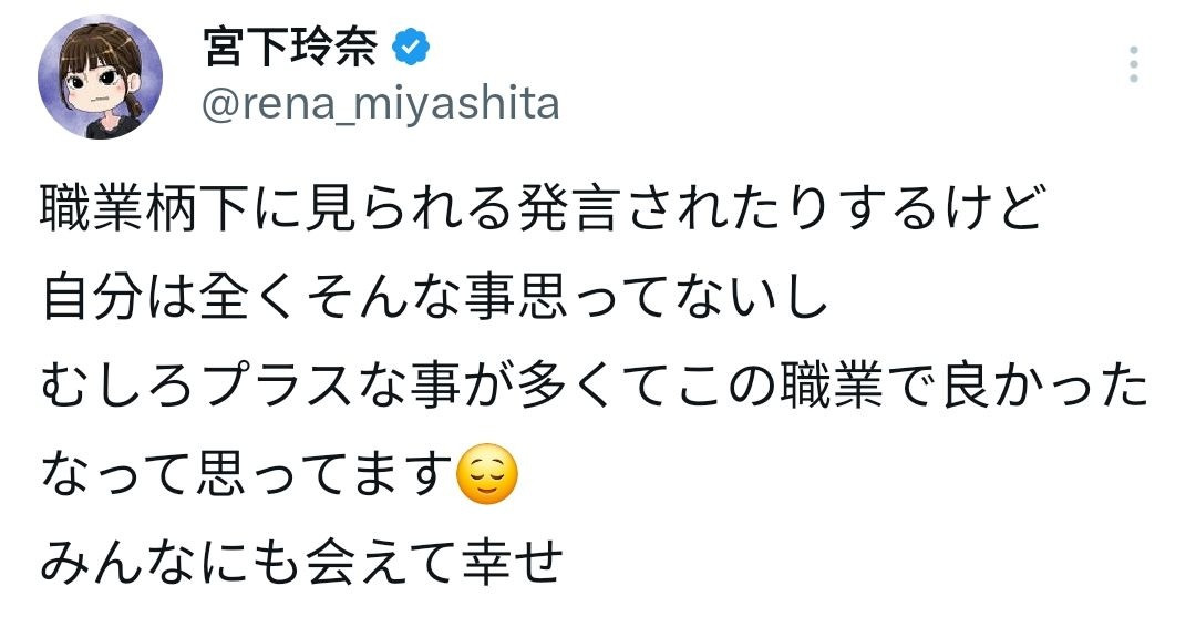 刚说回来,虽然关闭了留言功能,宫下玲奈在社群上还是很活跃的,发文很多、转推也活动,然后因为转推的没有关闭留言功能,所以想写一篇给看还是留言的;而在不用文章看那么多留言之后,宫下玲奈在27号的时候发表了自己对AV女优这个职业的看法,让我直接翻译给大家看: