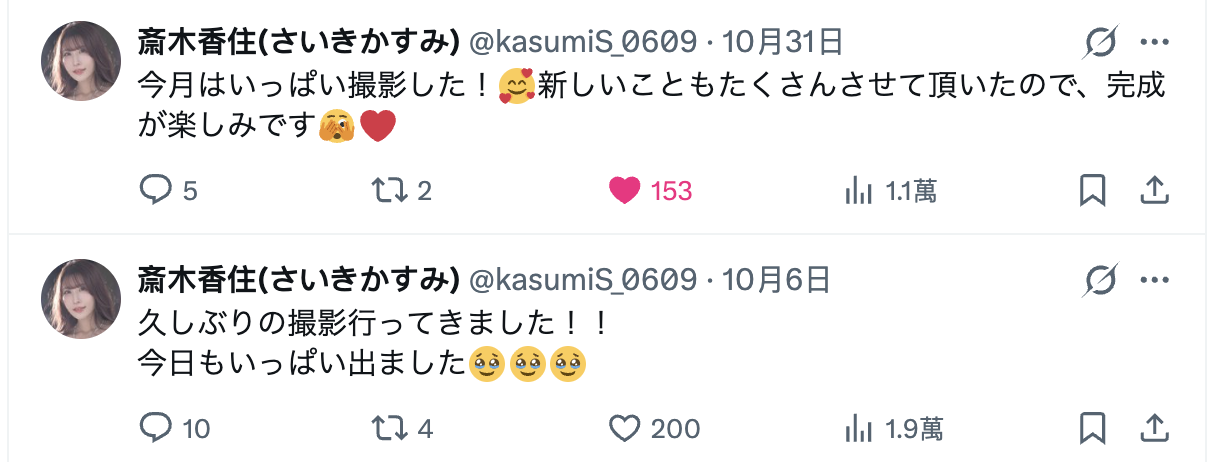 之所以这么说是因为斎木香住(斋木香住)在X(https://x.com/kasumiS_0609)上更新的消息:她是个蛮有趣的女优,在暂停发片的时候她几乎没在更新社群,但她有提到两件重大讯息,一个是在KANBi的片子发完后她今年不会再有作品了,第二个则是「10月拍了很多作品」: