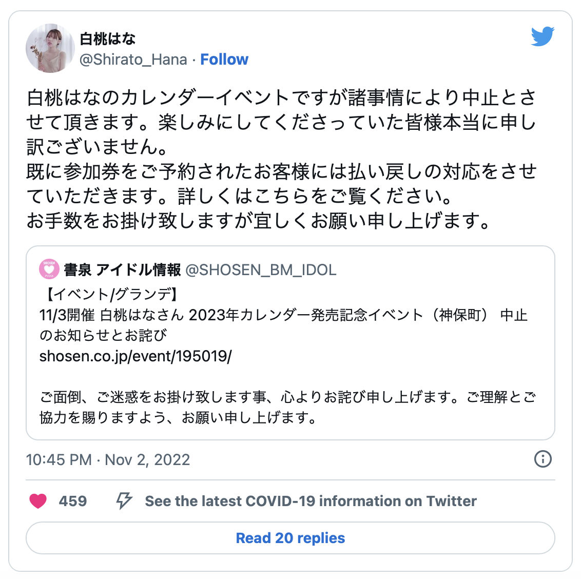 事务所没说太多,但至少在10月初她是没问题的,在确定うんぱい(Unpai)摄影会的时候经纪公司有问谁在海外有机会走红,我那时就有提到白桃はな(白桃花),那时经纪人还说请务必带她去台湾玩,如果那时候就出了问题应该不是这么说吧?
