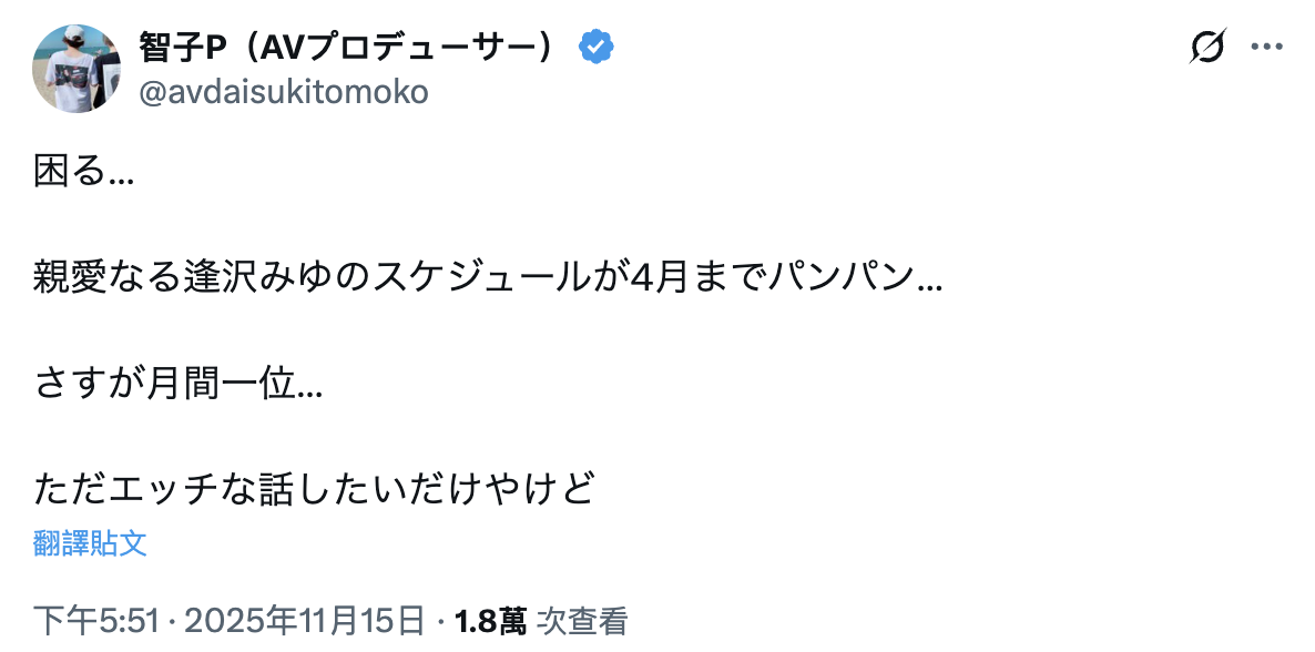 为什么是「公认」呢?因为资深制作人「智子P」是在X(https://x.com/avdaisukitomoko)这么写的:「」