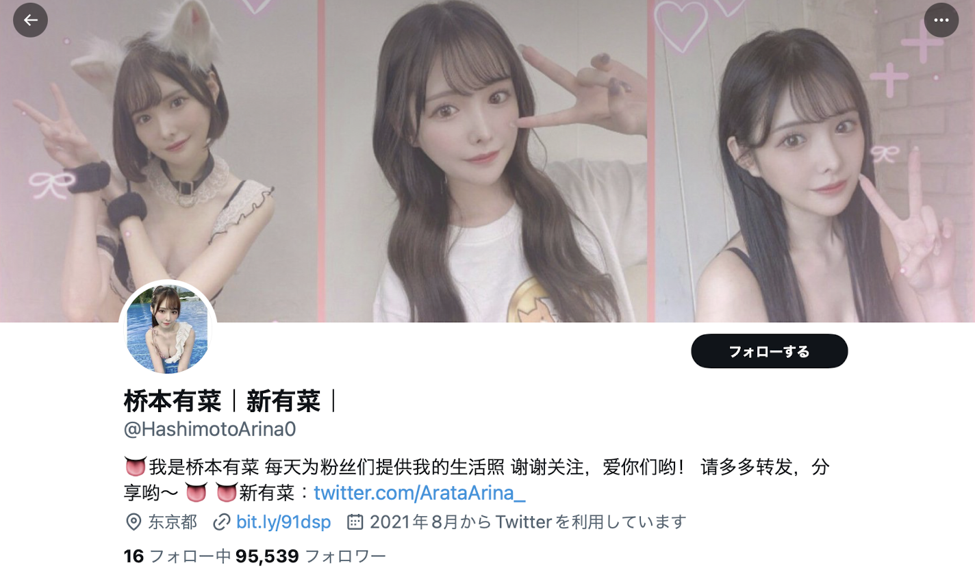 为什么我能确定呢?因为新ありな(新有菜)的老板就在我背后,他看到那些帐号非常火,正在问怎么做才能消灭这些冒牌货;不过话说回来,这些假帐号也真的蛮厉害的,像这个桥本有菜的假帐号都快10万追踪了,很多女优从出道到毕业都没那么多粉丝,然后,这些假帐号还会吸引一些女优追踪,会让一些搞不清楚状况的粉丝以为这些是日本授权的中文帐号: