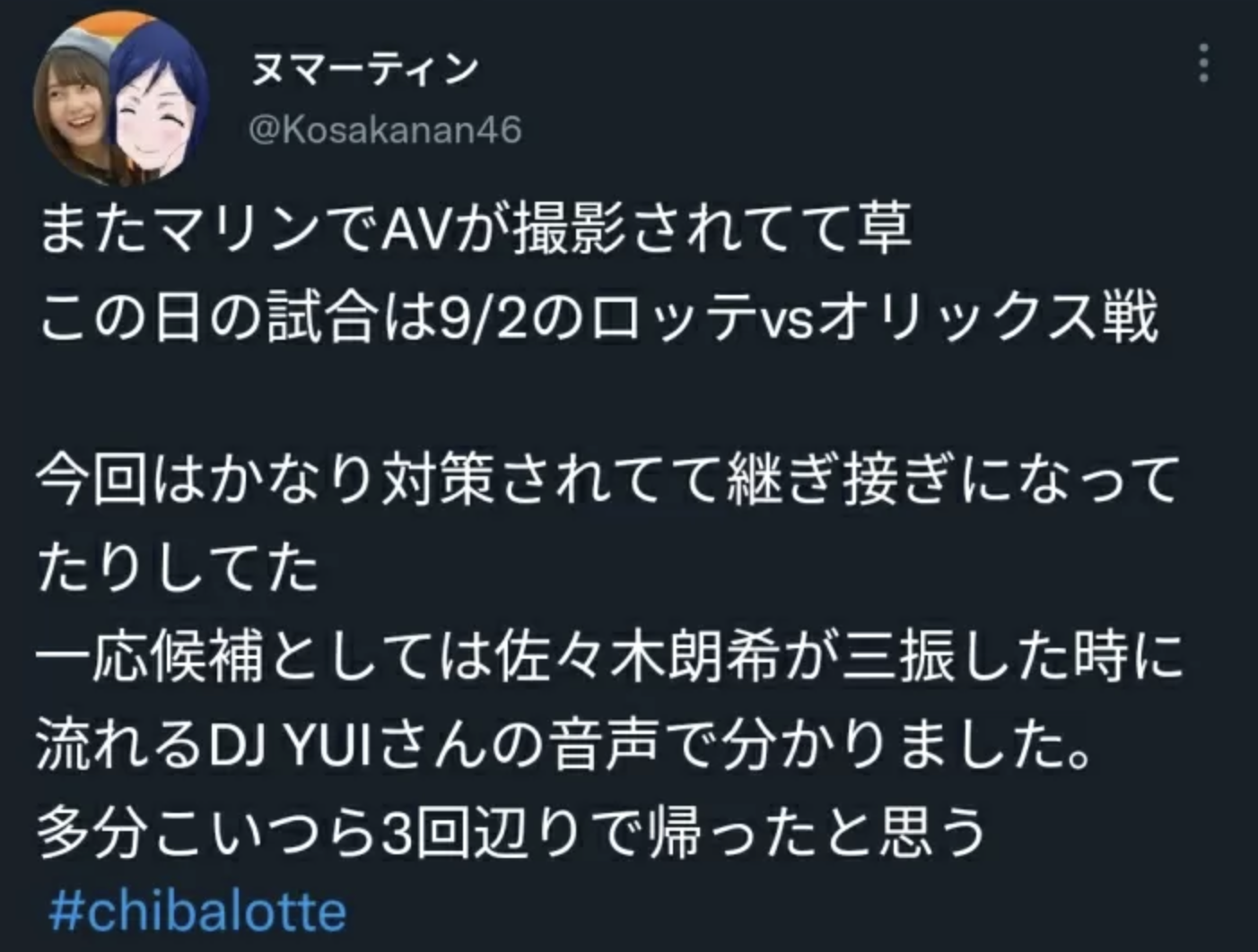 好像真的还好,这有什么好介绍的呢?答案是这支作品真的有去职棒球场拍摄美咲かんな(美咲佳奈)被放鸟的样子,在这篇评论里就有提到片商去的是9月2日于zozo marine field举办的オリックス(Orix、欧力士)与ロッテ(Rotte、罗德)队的比赛,两队的先发投手分别是山崎福也(欧力士)与佐々木朗希(罗德),片中还可以听到3局上球场广播佐々木朗希投出三振呢: