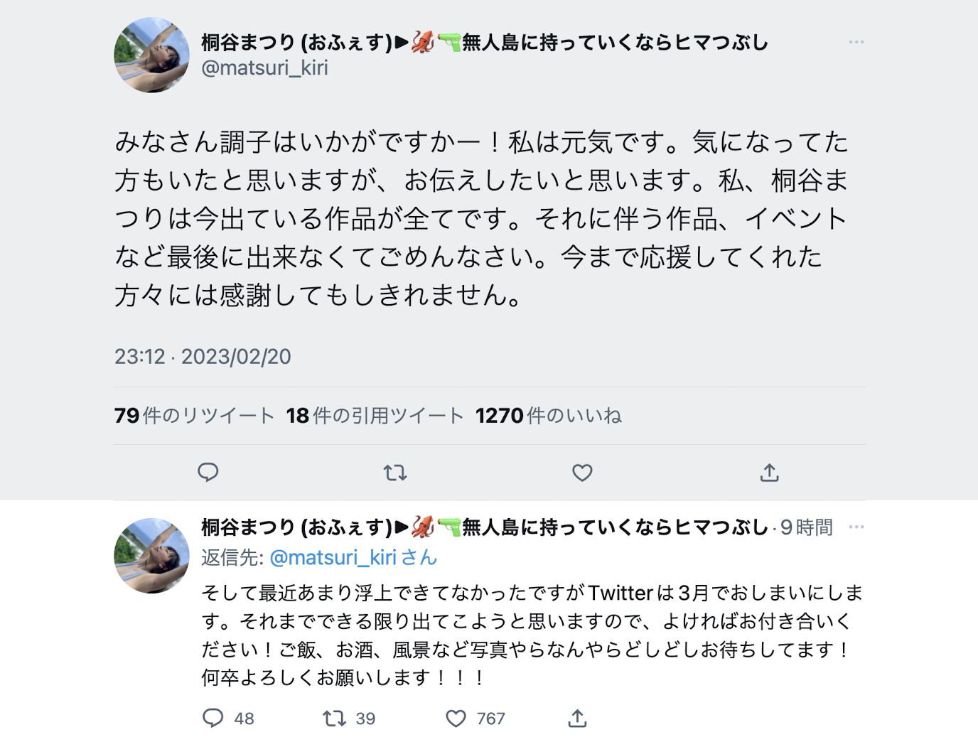 不会再有新作、twitter消灭倒数计时⋯桐谷まつり(桐谷茉莉)完全引退!