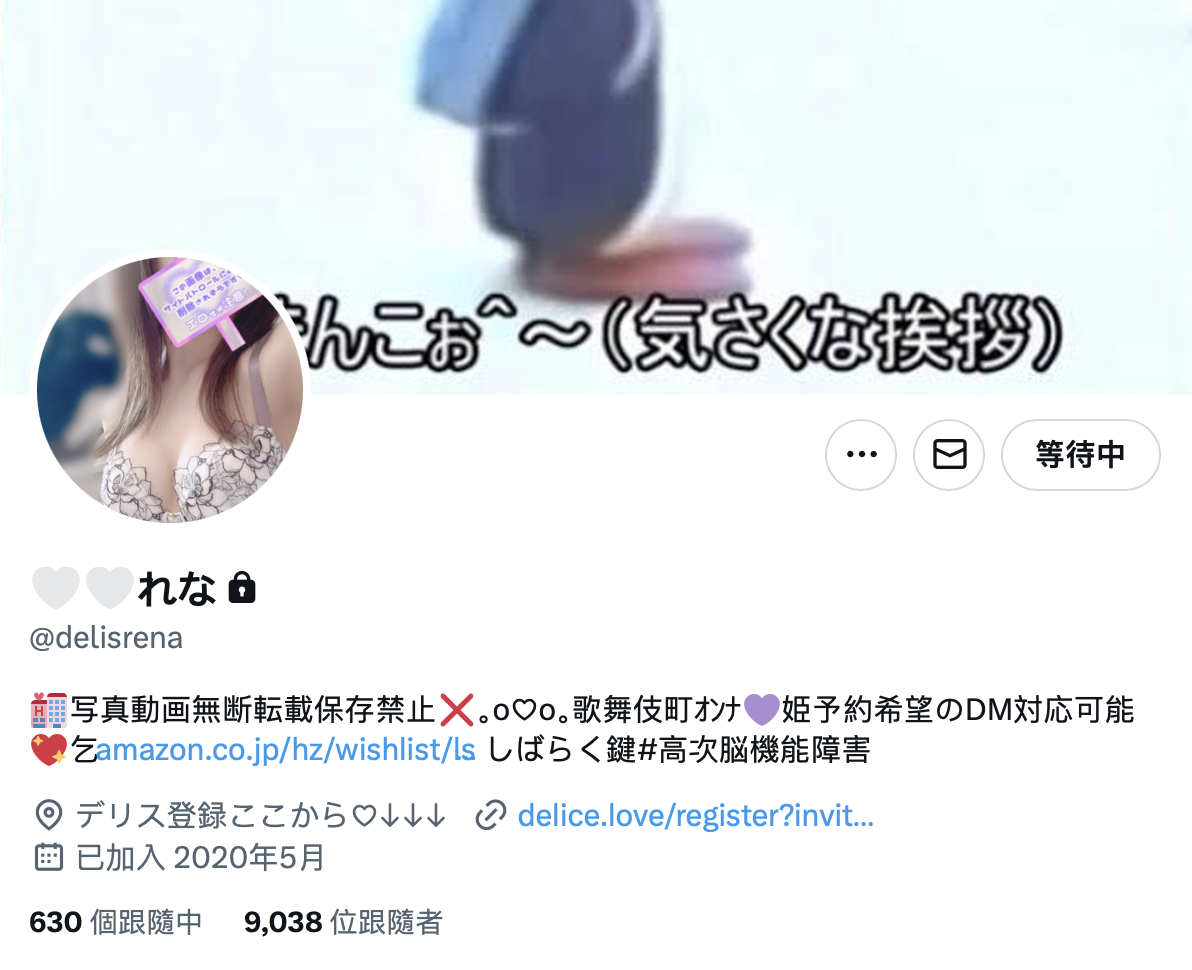 一块儿来看看这个twitter帐号(https://twitter.com/delisrena),目前这个帐号已经锁起来了,不过从自我介绍栏又是「歌舞伎町」又是「予约」这些关键字你就知道帐号的主人是做什么的⋯