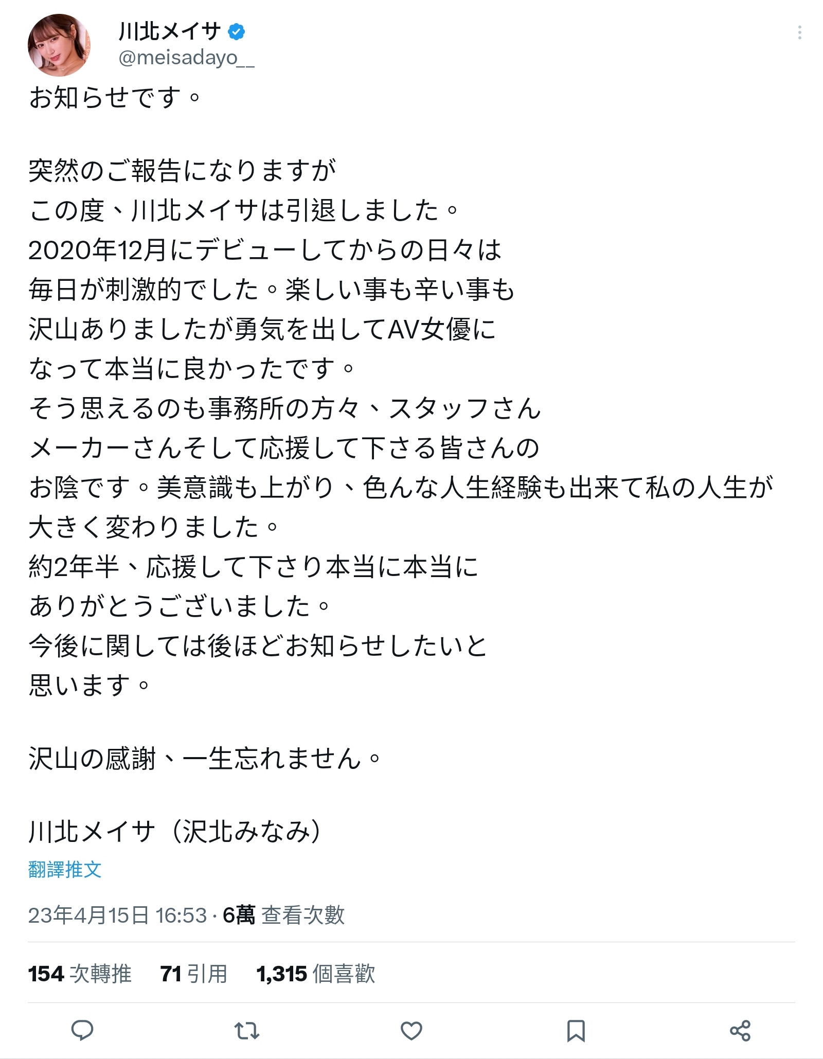 不是才回归原来的事务所然后把名字改回来了?结果两个月多的时间过去,片商FALENO STAR出道、当初号称是9头身超小颜Face的天然白虎「川北メイサ(川北明沙)」突然在今天宣布引退,真是一整个奇怪⋯