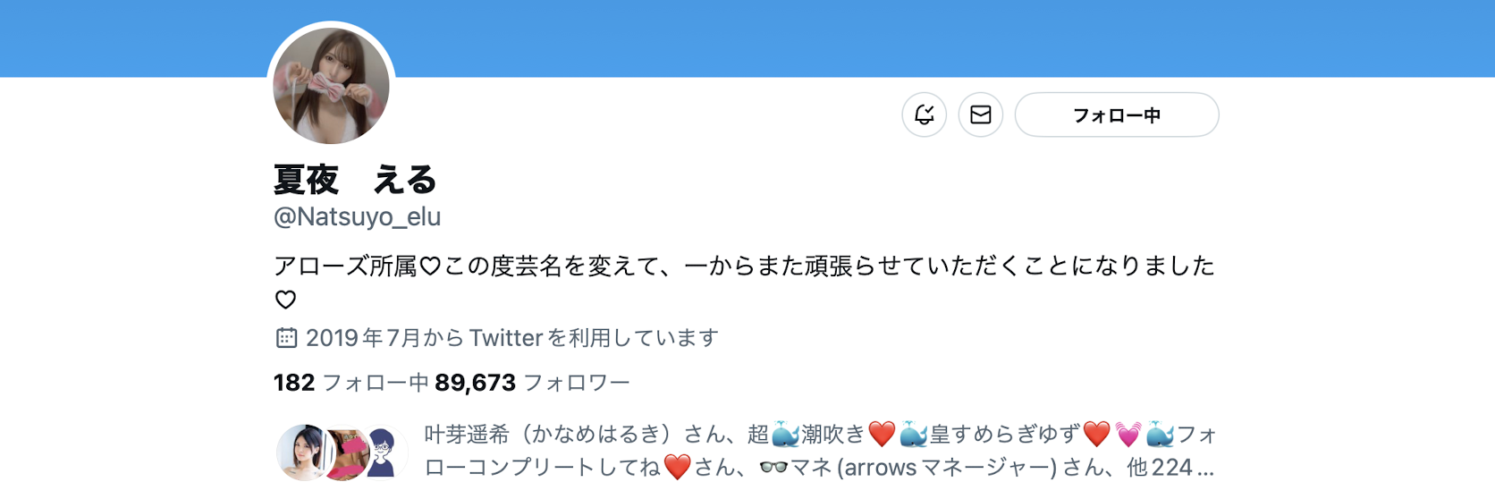 是的,大势底定了,夏希まろん(夏希栗)已经成为过去式,以后要叫她夏夜える(夏夜绘琉)了:于此同时我们也知道她的新事务所是Arrows,另外,原本说要放弃twitter的她最后还是把社群拿回来了(https://twitter.com/natsuyo_elu/),所以她的帐号才会是2019年注册、目前有接近9万人追踪(当然帐号名称改了也把之前叫夏希时的发文全删了)〜
