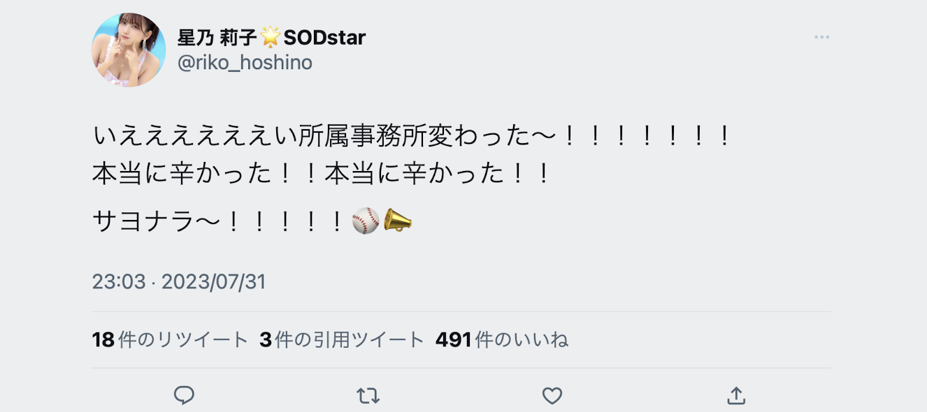 这就是为什么明明只是更换事务所的小动作我却特别拿出来写的原因,因为姫宫すみれ(姬宫蓳)写出来的东西是非常强烈的指控,我觉得有必要写出来给大家知道,至于星乃莉子的状况不会有太大变化,她依然是四小天后中的高手高手高高手,SOD STAR不会因为她换了事务所就对她不好,反而有可能因为HANAYA Project的关系对她更好!