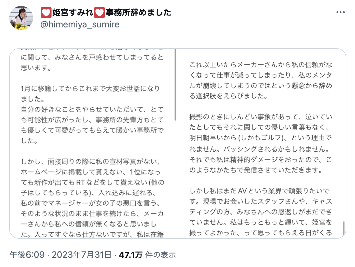 到底发生什么事?从姫宫すみれ(姬宫蓳)的文章大概可知一二,我直接挑最严重的说好了,就是经纪人对她性骚扰,因为Jetstream这家经纪公司来自北海道,有些时候片子拍得晚一点就回不去,这时候经纪人就会要求她一起睡在事务所里⋯
