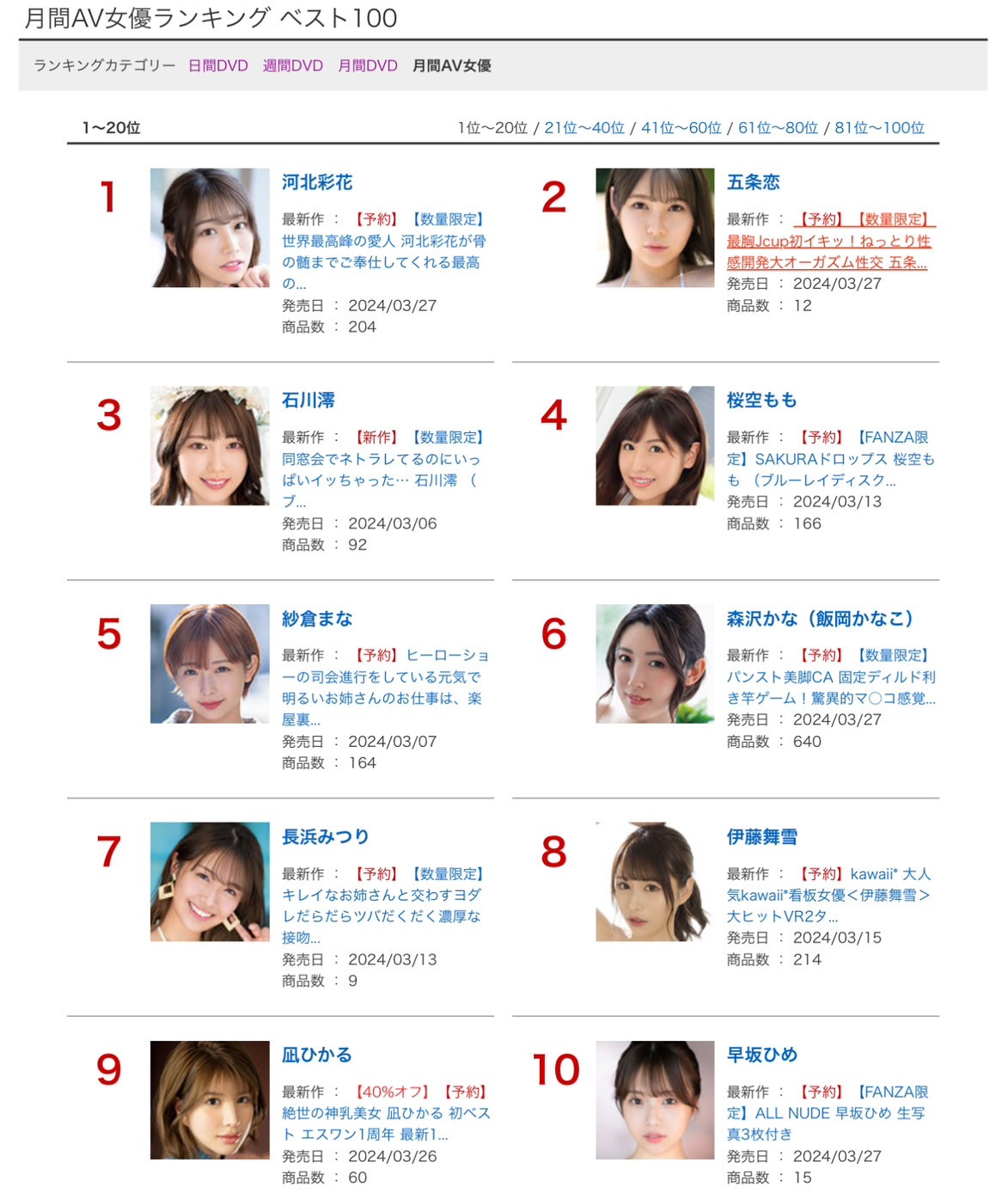 不过最重要的还是,她河北彩花啦,有她在没什么片子卖不出去的;第三名的作品「ヒーローショーの司会进行をしている元気で明るいお姊さんのお仕事は、楽屋里で性欲处理として中出し轮●される事も含まれています。」说明了纱仓まな(纱仓真菜)就是现代神兽,不管是艺能人还是超级新人又或者是谁通通都不是她的对手,她是名副其实的SOD一姐也是业界的指标;接着第四第七两位都是FALENO STAR的新人,虽然最近台湾女优那块碰到很大的麻烦,不过FALENO STAR的正规部队表现不错,在FANZA修改规则不得任意退片后两位新人「御园もも(御园桃)」和「吉沢梨亜」的成绩应该没什么灌水的成分,虽然不知道未来会怎样但至少是个好的开始;接着第五、第八、第十都是片商S1的大奶宝,凪ひかる(凪光)就算社群用得少但火力实在旺,清原みゆう(清原美优)我不只一次说过她就是S1的新神乳,至于第10名五条先生的作品并非AV而是写真,请大家务必记住这支作品,等等介绍销售排名的时候会用到〜