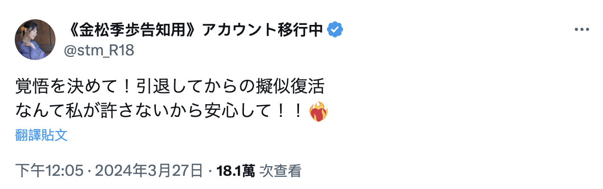 金松季歩是在自己的X(https://twitter.com/stm_R18)说了,Muteki这家片商就是片子没发出来前不会给你看封底的,意思就是说问题不是出在我身上,要怪就怪片商喜欢吊胃口—不过大家想看封底的道理也很简单,就是要确定金松季歩的这次作品到底演了什么?是写真还是AV、如果是AV那是打真军还是玩假炮?虽然答案很快会随著作品上市揭晓,但大家还是想提前知道⋯