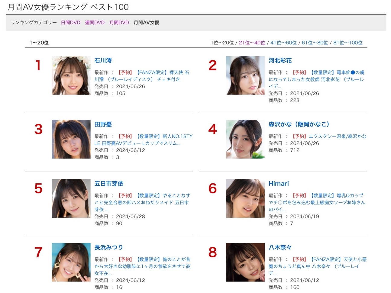 这就要从FANZA排行榜计算的方式说起了,石川澪称霸的「月间AV女优」排行榜计算的是女优在5月的销售总和,意思如果你一支作品可以卖1000片,3支作品加起来3000片就会比只有一支作品卖出2500片的女优排名更高一点;明白了这点再来看月间DVD排行榜你就知道怎么回事了: