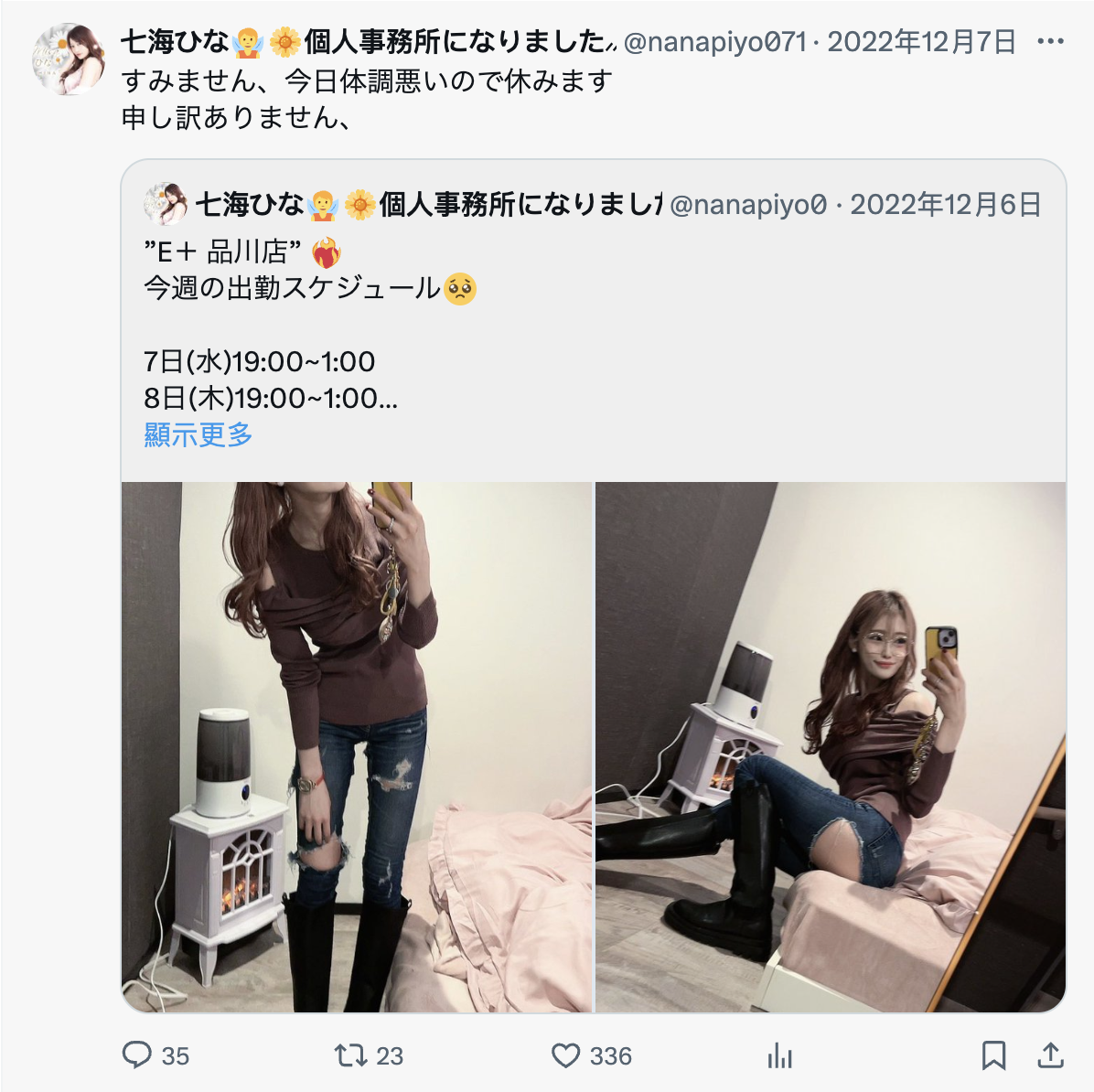 七海ひな的X停在了2022年12月,当时是说身体不好取消活动,然后就没再更新了。