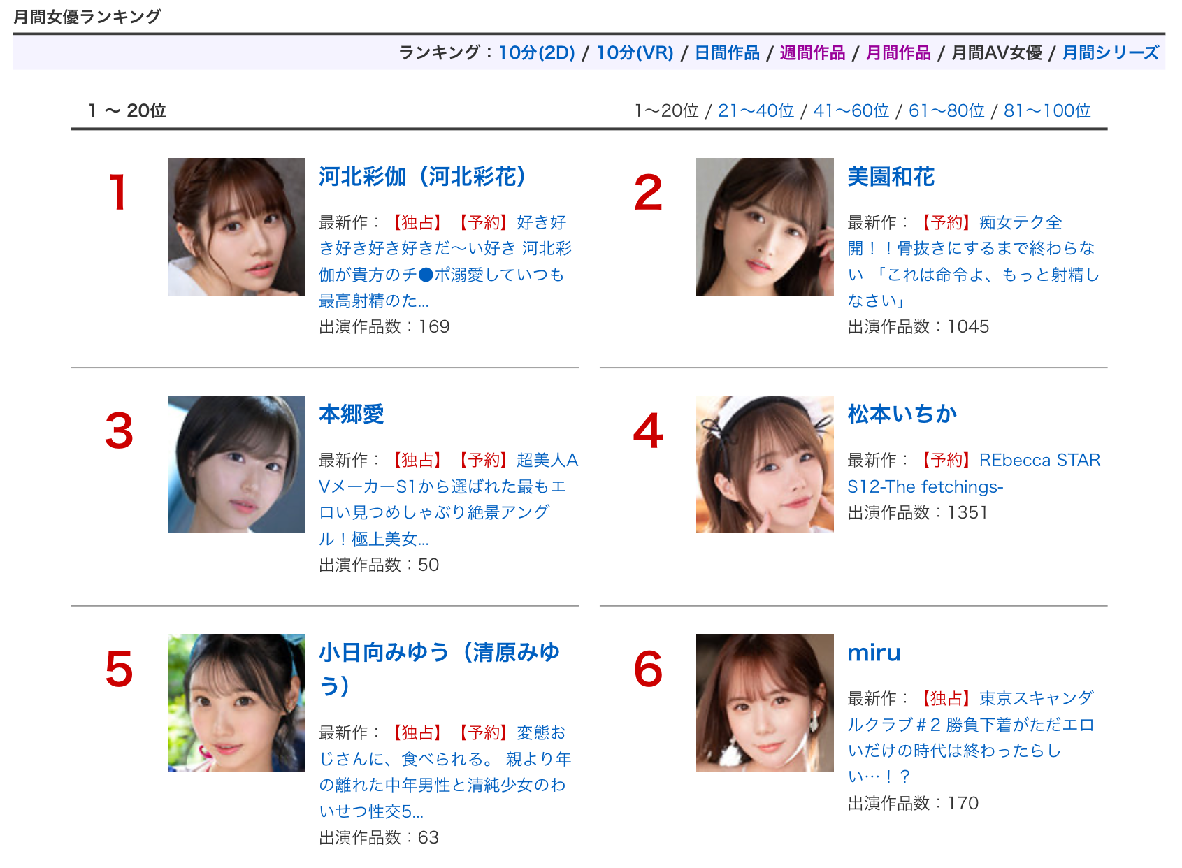 为什么要问这个呢?因为她2月没有新片,也就是没有可以预约的作品,只有已经上市的出道作可以购买,所以从排行榜就可以知道她出道作的成绩如何、重回发片行列的「河北彩伽」有没有拿下冠军宝座?