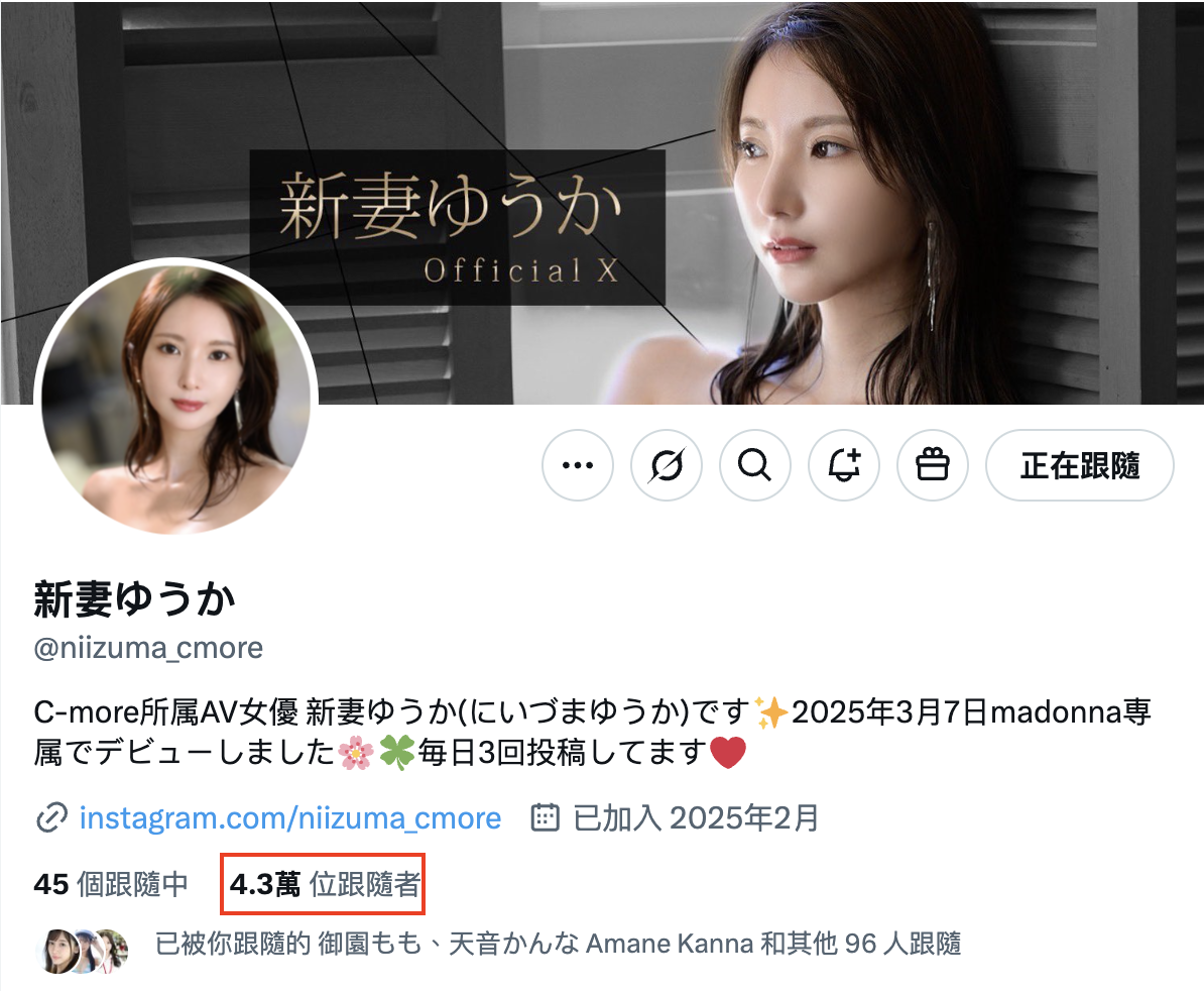 也条件实在太优秀,所以片商的人设非常简单,就是个结婚6年的人妻ー但就靠着漂亮的照片每天上传、在出道作首发的同时新妻ゆうか(新妻优香)的社群已经积累了超过40000人追踪,非常优秀~