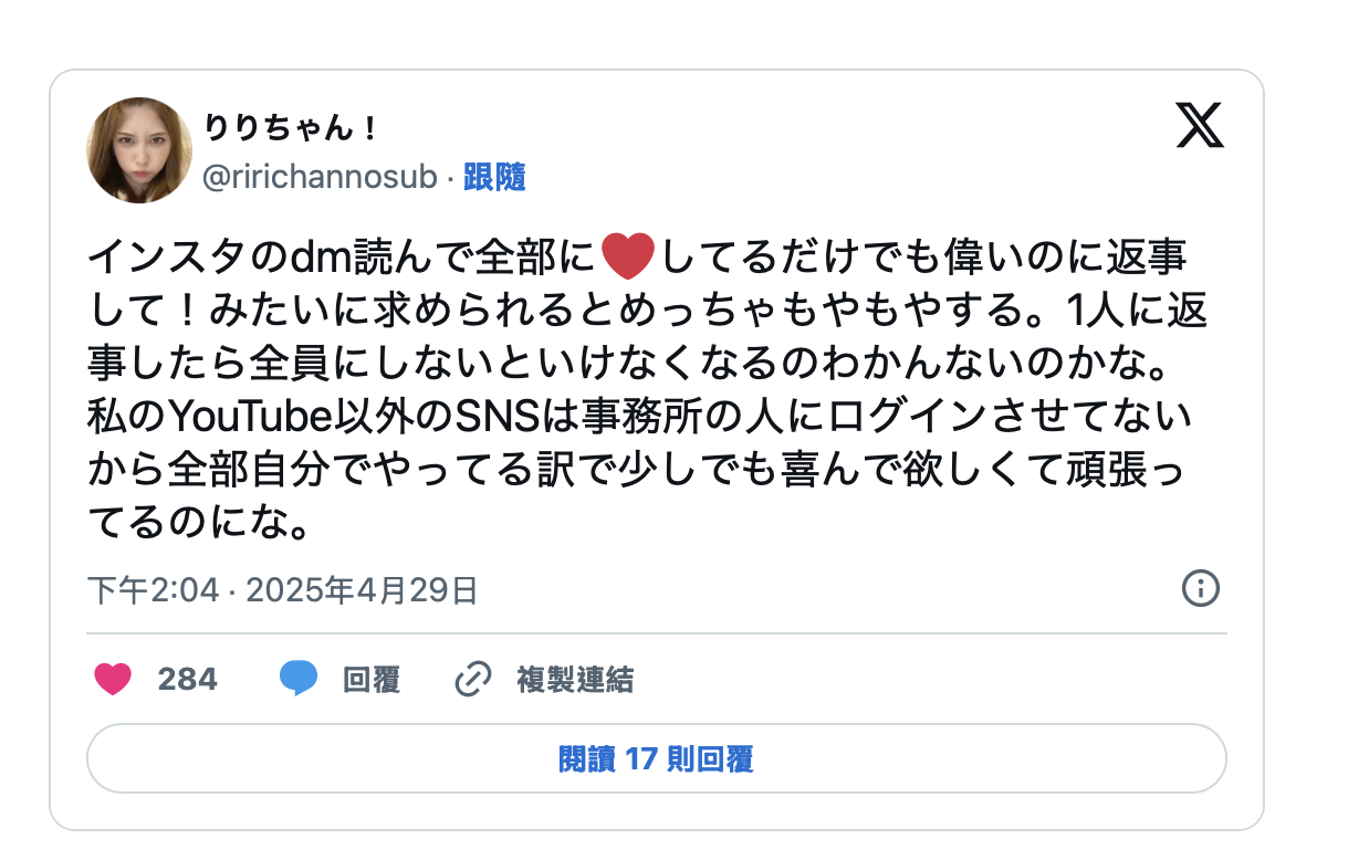 尽管女优都会说私讯由事务所管理,但其实很多人会看,有些人甚至拿粉丝的私讯询问来当发文的内容(比方说那些很恶毒的私讯),当然,也有些女优会回覆粉丝的私讯,我私底下问过几位女优,她们最常回覆的私讯是影迷询问活动的日期,接下来就是说粉丝自己生日想要祝福,她们就回个生日快乐~