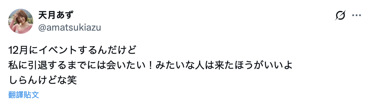 蛮明显的,天月あず(天月杏)只差没和大家说「因为要引退了所以你们(粉丝)再不来就见不到我了」,我比较好奇的为什么不直接公布什么时候要引退?但她既然这么说了,那应该就是决定好惹,我认为引退的时间点可能是在2025年12月31日: