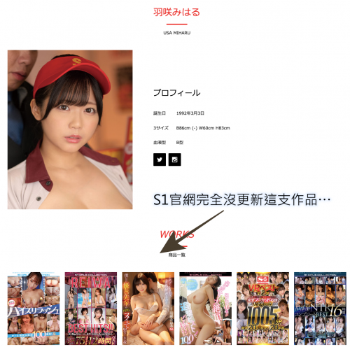 不只官网首页,点进羽咲みはる(羽咲美晴)的页面也找不到这支作品,但奇怪的是S1的官方twitter有宣传这片、FANZA也找得到这支作品,所以我就不知道是S1忘了在官网放上这支作品、还是FANZA忘了把这支作品下掉?