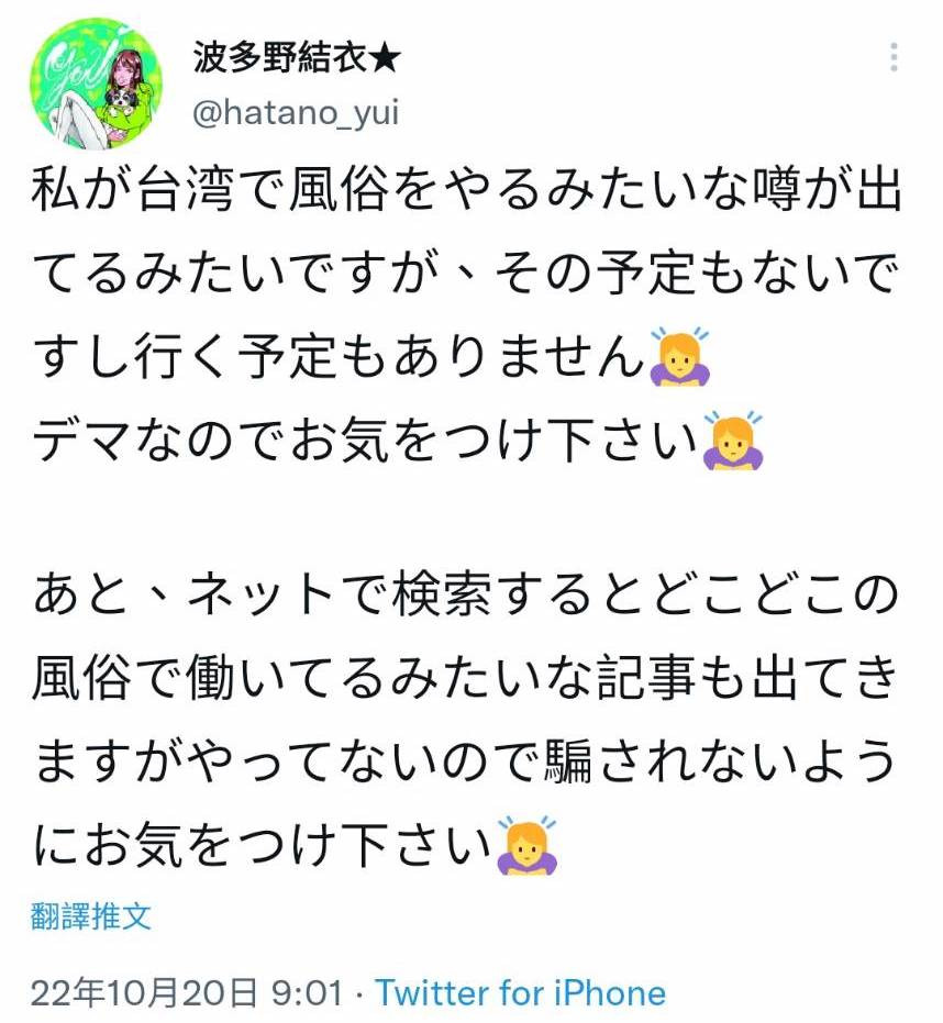 她在twitter上写了,没有来台接客的计画,同时还加码说自己也没有在风俗店上班,那些在网路上流传的谎话千万别当真⋯